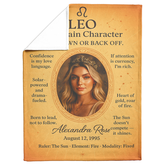 LEO – The Main Character Personalized Zodiac Blanket | Custom Photo, Name & Birthdate | Regal Gold Sunburst Leo Fleece or Sherpa Blanket